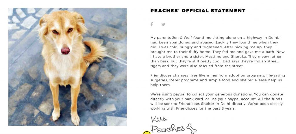 “We wanted to raise money for Friendicoes instead of gifts because there is nothing we need in our lives that we can’t wait for or don’t already have. We wanted to do something meaningful that will hopefully change some animals’ lives.” said Jenny, the radiant bride, when asked what inspired this decision. The site sees Peaches, without dispute the official wedding registry chairwoman, making an appeal, along with Massimo and Sharukka, for help to be provided to the shelter. And when such adorable cuties stand up for their less fortunate friends we are not surprised that the booty amounts to over £1000 (INR 80,000+). For us it has been a heart-warming experience to know that there are people out there who care so greatly and are willing to give so selflessly to the animals, and to a charity many miles away from home.