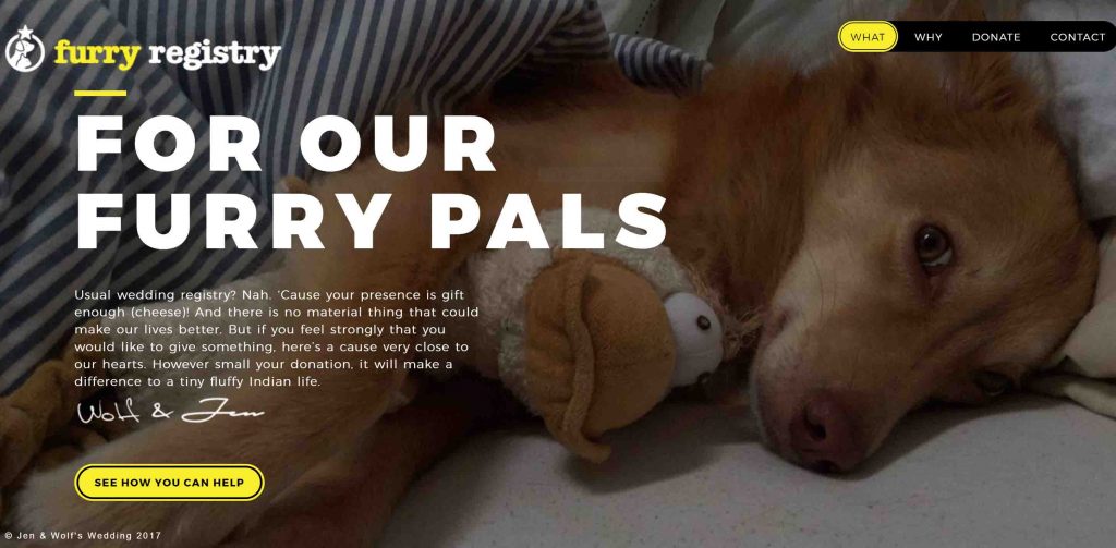 Recently the couple got married, the big day was on 29th April 2017. While over the years they have continued to support Friendicoes in whatever way they could, it still was a pleasant surprise to be made a big part of their wedding. An important aspect of the classic white wedding is ‘the wedding registry’. It is “a service provided by a website or retail store, which assists engaged couples in the communication of gift preferences to wedding guests.” In other words, it means that the couple can let the guests know their preferred gifts. So, Wolf & Jenny decided to put a slight twist on this tradition. Instead of a traditional wedding registry, they curated this site http://street-animal-donation.org/ which allows the wedding attendees to donate to Friendicoes in lieu of wedding gifts.