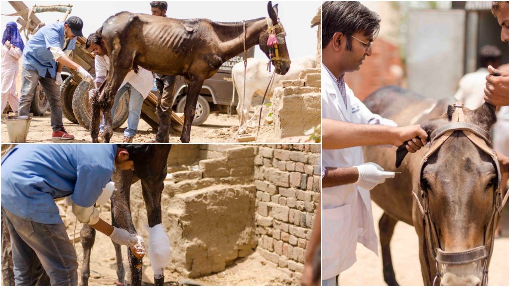 The team sees a minimum of 25 to 30 cases each day, with over 50 cases in the brick kilns during season. Every week the cycle is repeated, providing first aid, treating chronic cases and providing help to animals hitherto at the mercy of quacks and home remedies. The cases attended are enough to make a gentle heart faint. Broken bones that have healed improperly, or multiple breaks in the same area due to improper healing are commonplace, so are burn marks from hot iron rods, a common home remedy applied to broken bones. The worst part is that the animals still are made to work through all these injuries. The equine team tries to provide proper treatment for these animals and offer them some comfort in a life full of gruelling hard work and neglect. Apart from medical assistance, the team also distributes soft-pad saddles made of cloth for the pack animals, farriery service, blankets in winter, shade and shelter wherever possible, troughs to make drinking water easily available as well as educating and sensitizing the owners to take better care of their animals.
